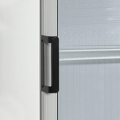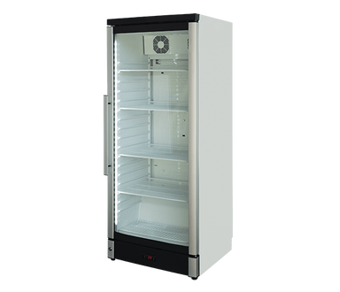 Features Hinged alu-framed glass door Reversible door Adjustable shelves Adjustable feet LED interior light Fan assisted cooling