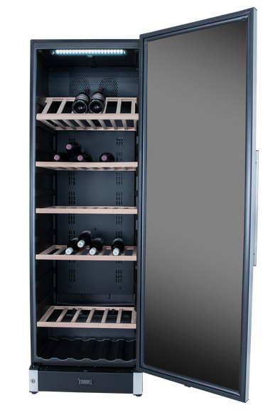 Exclusive wine cabinet with storage room for 187 bottles. The cabinet contains adjustable wooden shelves plus an integrated shelf at the bottom....